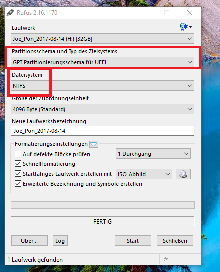 In Rufus dann , GPT Partitionsschema für UEFI , Dateisystem NTFS einstellen.