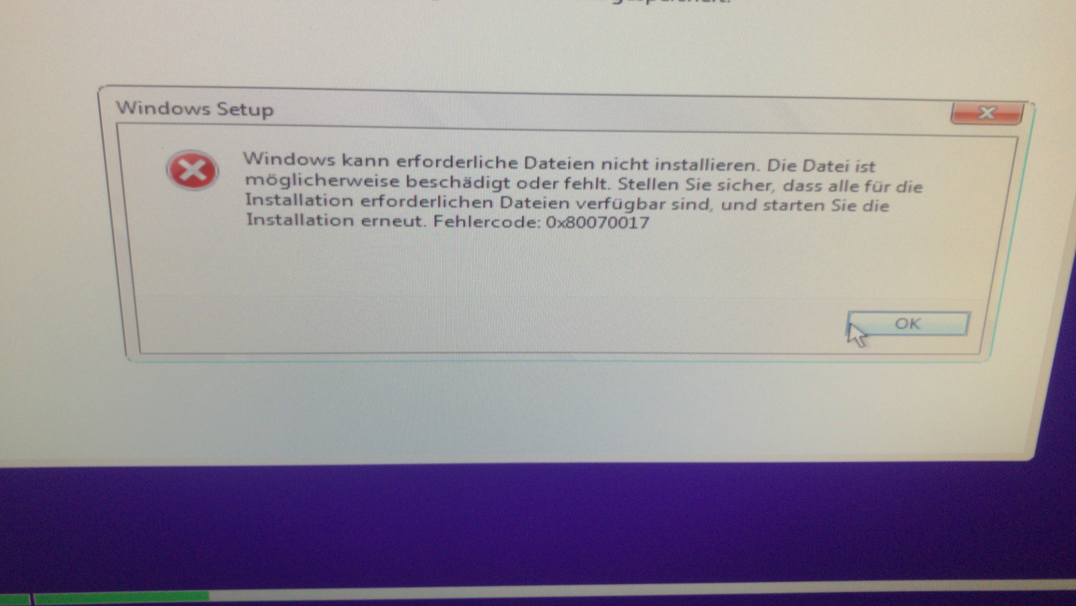 Pustekuchen. Seit 5h versuche ich nun das Betriebssystem aufzuspielen, bekomme jedoch mit 2 verschiedenen USB-Sticks, sowie einer DVD immer wieder die fehlermeldung „Windows kann erforderliche Dateien nicht installieren“ Fehlercode 0x80070017.