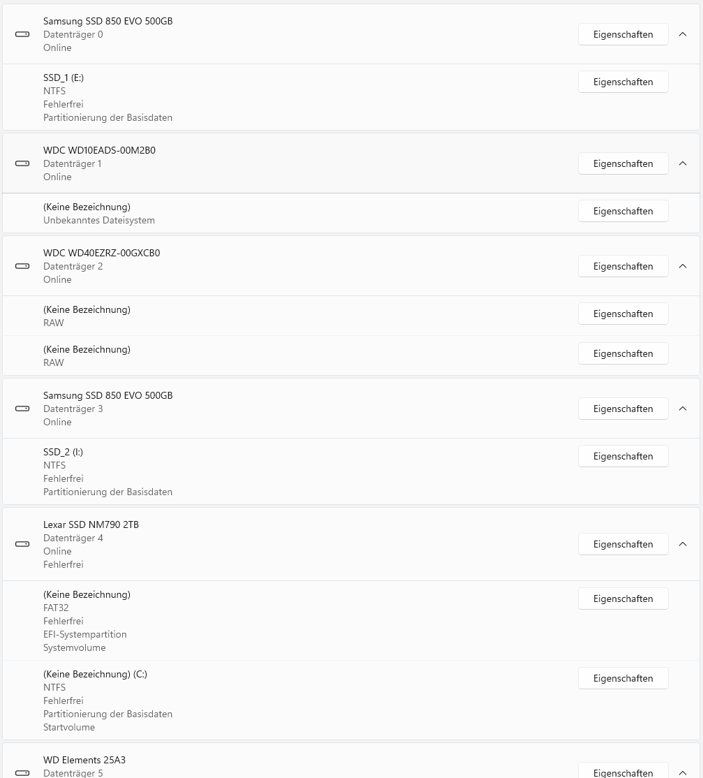 Mein System besteht aus einer neuen M.2 SSD, 2x Samsung S-ATA SSD und 2 älteren HDDs als Datengräber.