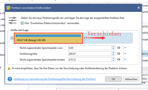 Das hat soweit alles funktioniert, aber ich kann trotzdem die nötige Partition nicht verändern/verschieben.