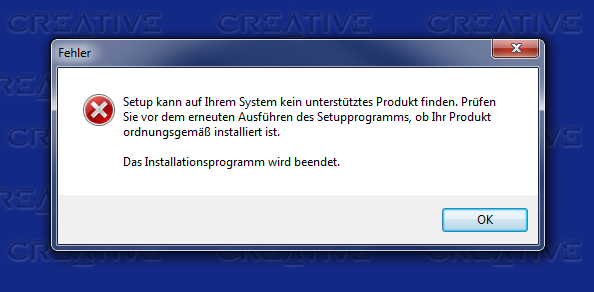 ich habe eine X-Fi Xtreme Audio und ein Teufel Konzept E Magnum daran angeschlossen. Ich habe mir jetzt schon einige Einträge durchgelesen und immer war der Daniel K Treiber des Rätsels Lösung. Allerdings will der sich bei mir nicht installieren lassen. Ich bekomme immer das Problem, was auf dem Bild zu erkennen ist (also das kein unterstützes Produkt gefunden werden kann). Ich habe daraufhin die Treiber nochmals deinstalliert und alles von Windows machen lassen (Windows 7). Da sagt er mir auch das ich die Soundkarte hab. Ich verstehe jetzt also nicht das Problem des Treibers.
