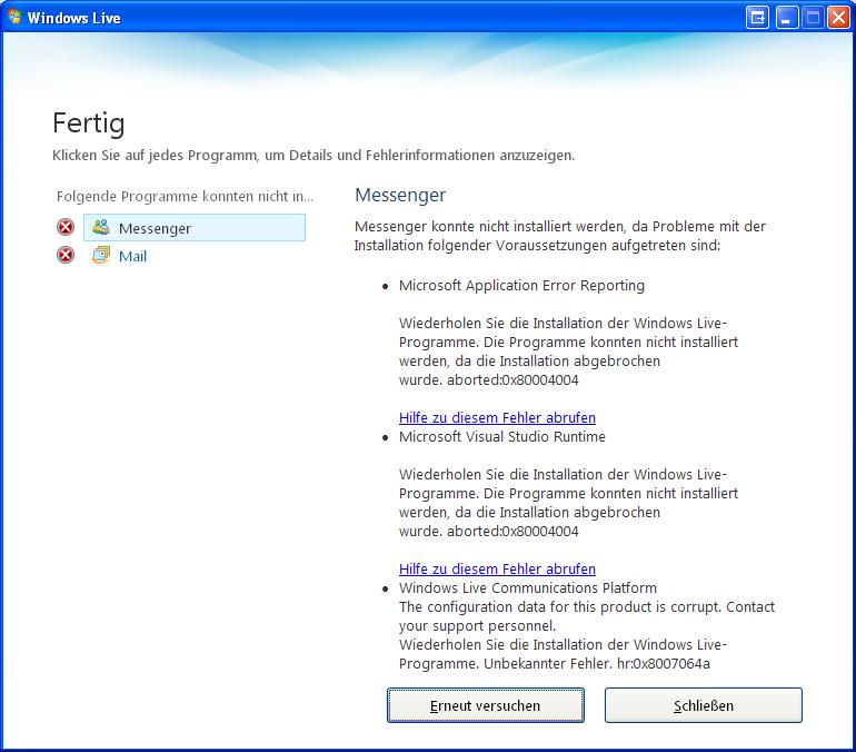 Wenn ich den neuen Windows Live Messenger installieren möchte, kommt das Installationsprogramm bis zum Fenster "Ihre Programme werden installiert". Hier arbeitet er einige Zeit, bricht dann aber ab und es kommt folgende Fehlermeldung (siehe Bild).
