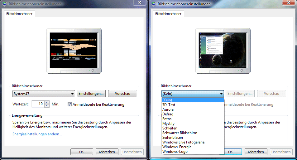 Hab jetzt mal zu den Bildschirmschonereinstellungen noch die über meine Systemsteuerung geöffnet, und davon einen Screenshot gemacht. Einmal mit besagtem Screensaver, einmal steht er nicht drin. Woran liegt das? (Links das Fenster das sich nach der Instalation öffnet, Rechts das was ich über Anpassen -> Bildschirmschoner öffne)