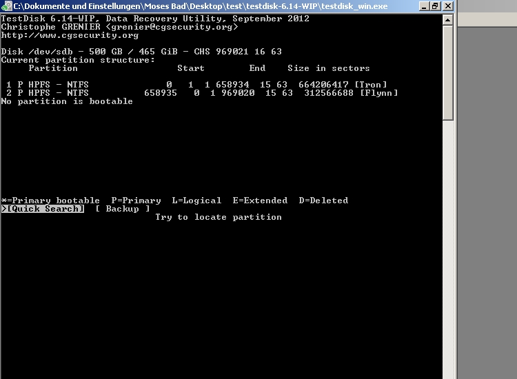 Mit den Screenshots in dieser Form kann man nicht mal erahnen, aus welcher Phase des Testdisk-Laufes die stammen - Anzeige der Partitionierung, nach QuickScan oder nach Deeper Search...
