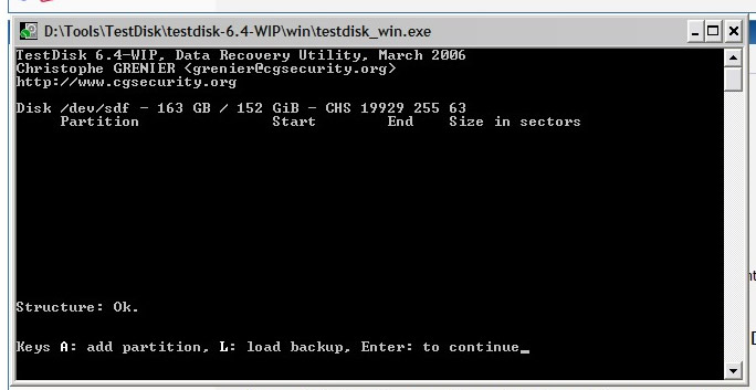Starte Testdisk und wähle wenn nötig deine Festplatte aus.