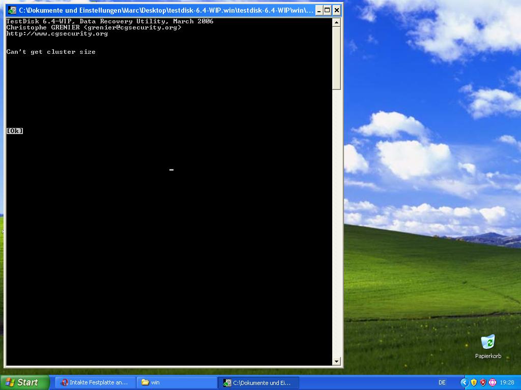 habe bishier alles so machen können wie es beschrieben war. hier bricht Testdisk dann allerdings nach 4% ab und gibt mir die Meldung: "Can't get cluster Size", woruafhin ich nur mit [Ok] bestätigen kann. (siehe Screenshot)