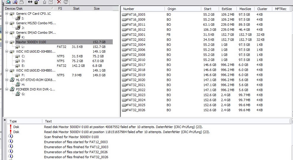 Wir hatten Bilder von der CF-Karte auf die Festplatte übertragen, plötzlich kam die Meldung "Datenträger nicht formatiert! Jetzt formatieren..." Laufswerkbuchstabe hat sich auch geändert, Dateiformat jetzt RAW. Nachdem wir jetzt mit TestDisk6.4 versucht haben, den Fehler zu beheben, kommt jetzt die Meldung "kann auf Datenträger nicht zugreifen...".