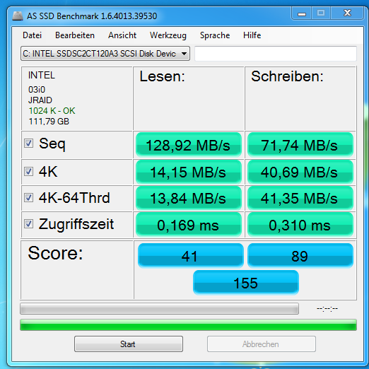 Ich habe folgendes Problem mit meiner Intel SSD der Serie 330. Und zwar ist die brechend Langsam. Laut Intel soll sie bis 500mb/s Lesen und 450mb/s Schreiben. Da komme ich ja nicht mal mehr annähernd hin. Muss ich noch Treiber, Firmware oder sonstiges Installieren ? Oder im BIOS was besonderes Einstellen ? *AHCI ist an!*. Ist das vielleicht das falsche Modus ?