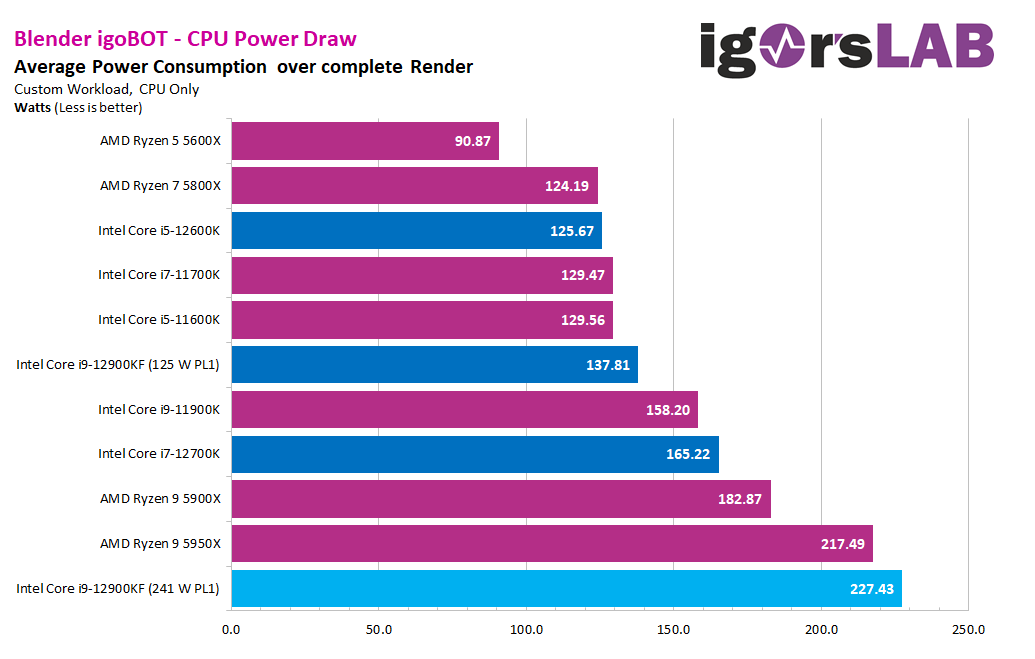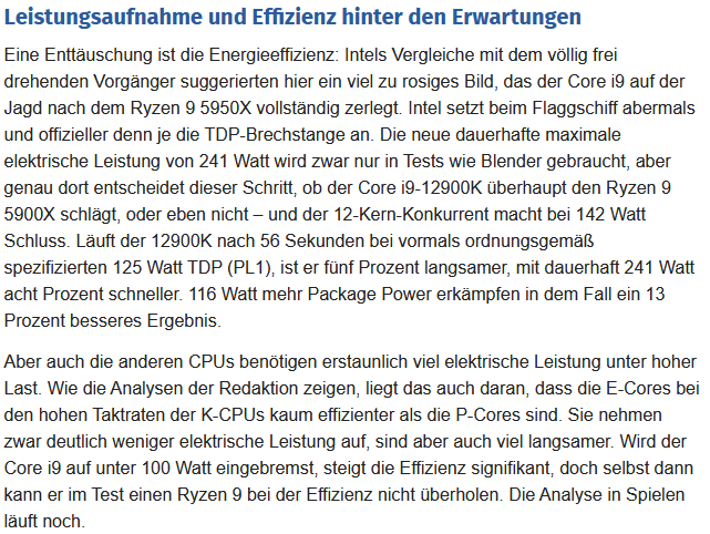 Am oberen Leistungsende zeigt sich: Ein Ryzen 9 5950X mit 16 „großen“ Zen-3-Kernen ist mit 142 Watt (max. dauerhafte Leistungsaufnahme ab Werk) schneller als ein Core i9-12900K mit bis zu 241 Watt, also wesentlich effizienter.