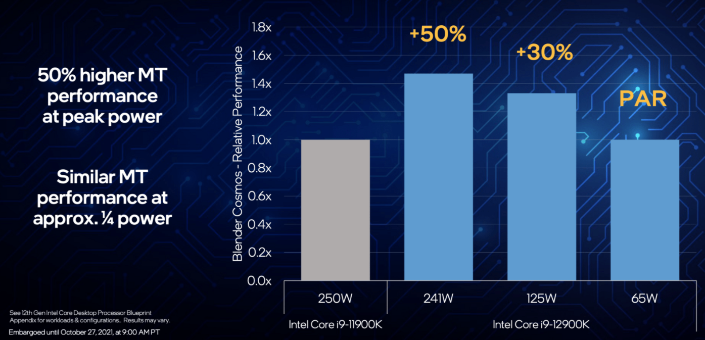 Die Leistung des 11900K erreicht Intel mit dem 12900K bereits bei 65W.
