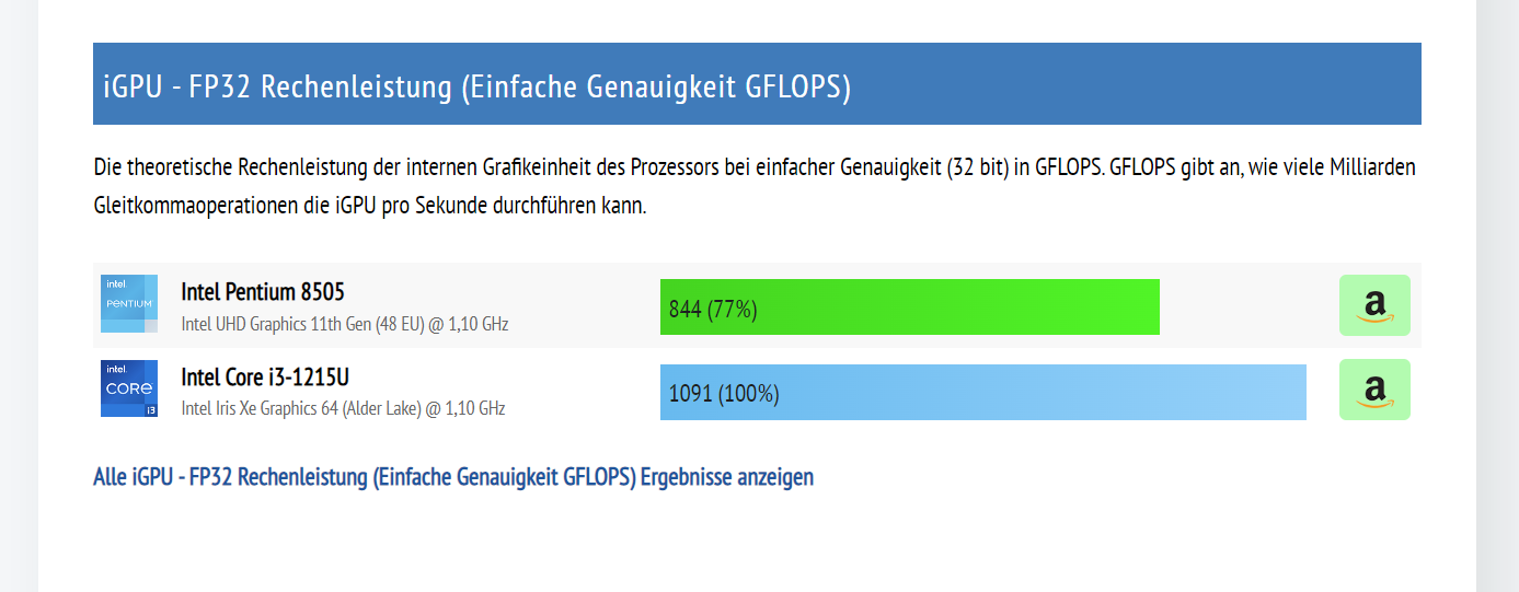 Will mir aus reiner Neugier ein AYN Loki zulegen den es mit mehren Optionen zu bestellen gibt. Die iGPU vom Pentium 8505 besitzt 48 EU die iGPU vom i3-1215U besitzt 64 EUs. Entspricht 25% weniger EUs gegenüber dem Pentium. Da ich keine vergleichbaren Benchmarks gefunden habe, wären meine Fragen: