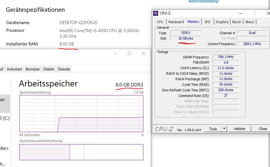 angezeigt werden im Bios, CPU-Z und HWINFO64 die richtige Menge, also 16gb