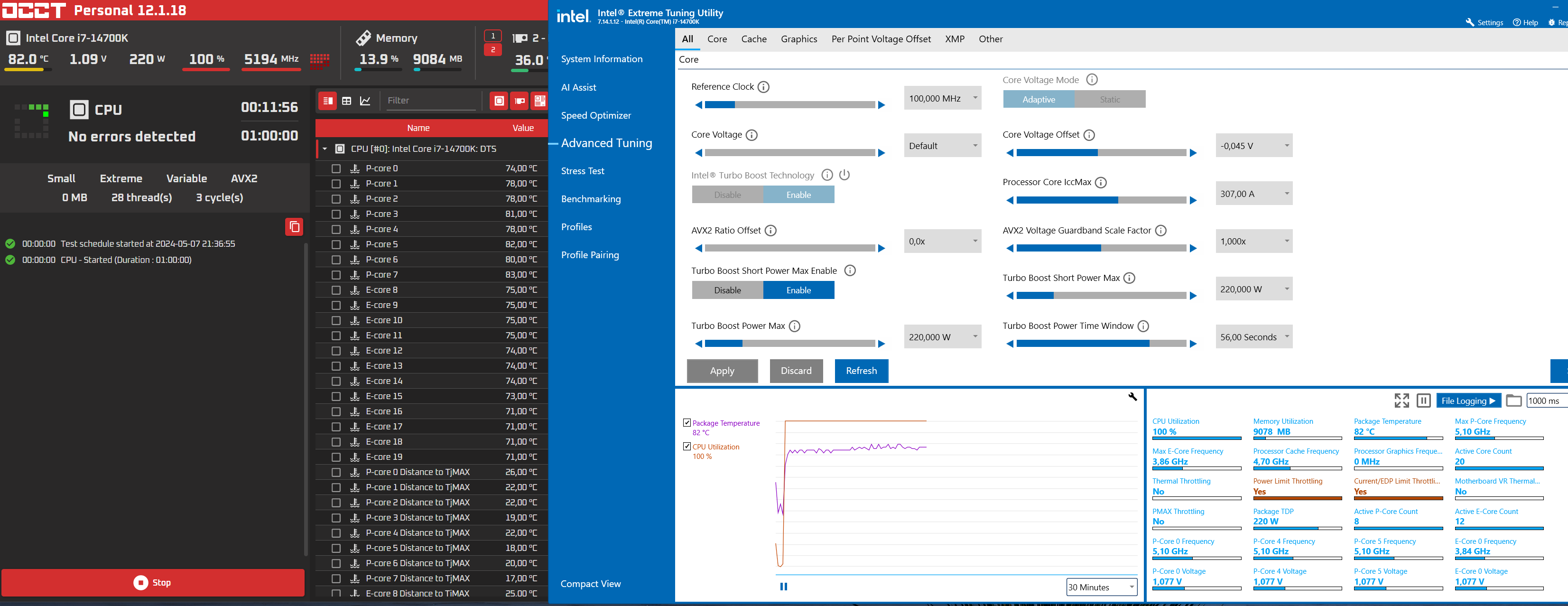 Im Extrem Profil versuche ich nun immer weiter zu undervolten und der Intel Extreme Modus wird immer performanter (CB23: 38.000 Punkte), da er weniger im Thermal & Powerlimit landet bzw. höher taktet.