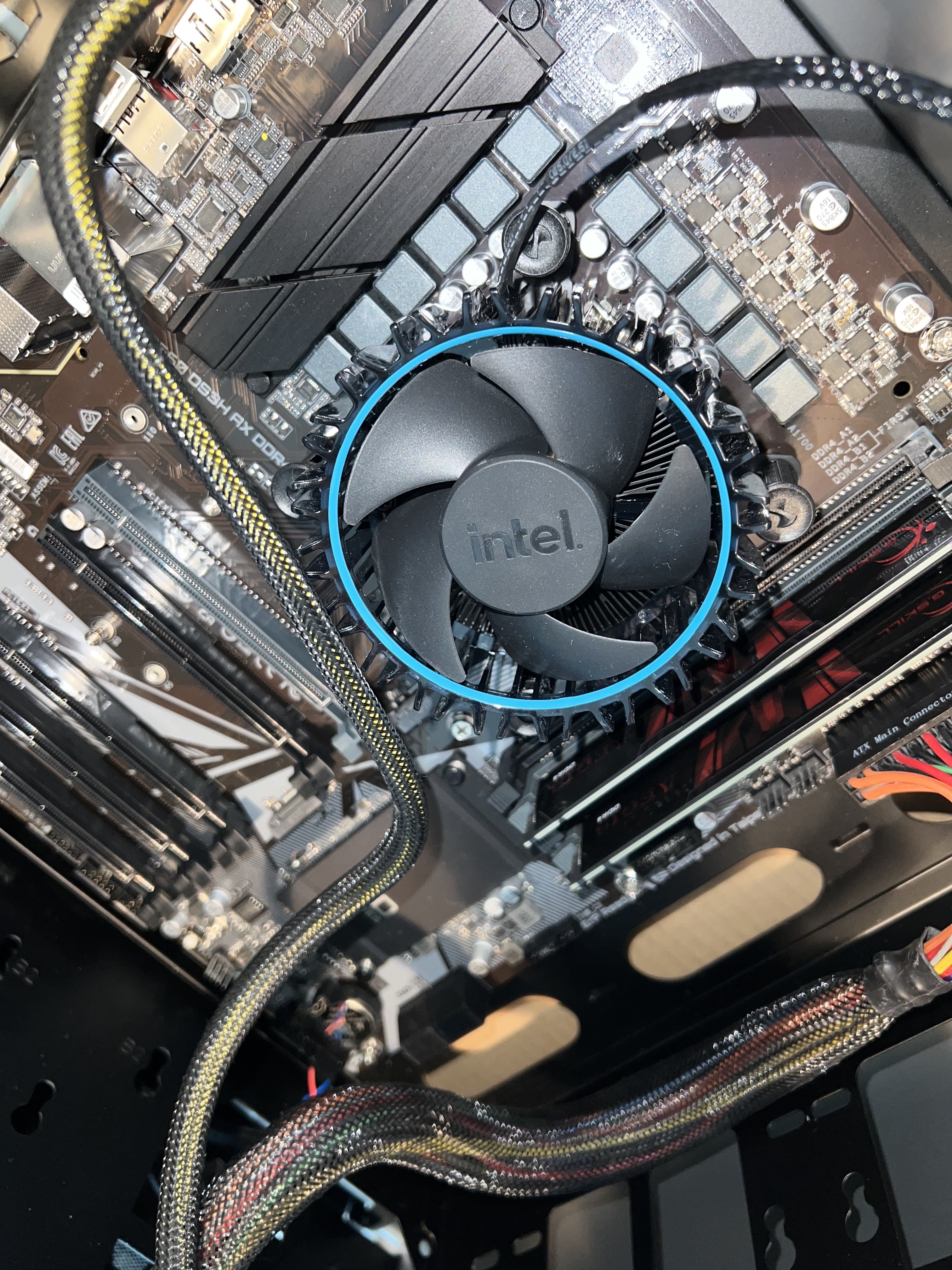 ich baue gerade ein Budget-System für meinen Dad zusammen, bestehend aus Intel 12100 + einem günstigen Mainboard mit Wifi. Habe das Gigabyte B660 DS3H AX DDR4 ausgewählt und siehe da, der Intel Laminar RM1 Kühler, der dem Prozzi beiliegt, passt nicht auf das Mainboard, da er oben u. links beim Absenken an die beiden Reihen von Kondensatoren stößt. Dafür, dass er so flach auf dem Board aufliegt, hat er einen zu großen Durchmesser, oder anders herum, für seinen großen Durchmesser hebt er sich nicht genügend in der Höhe ab.