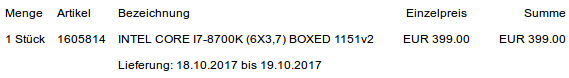 War bei dir noch das Lieferdatum 17. - 18.10.?MrJules schrieb:Hatte bis jetzt mit Conrad nie Probleme. Aber wenn das jetzt so weitergeht, dass sich das Lieferdatum immer um einen Tag nach hinten verschiebt, dann wirkt das tatsächlich unseriös.
