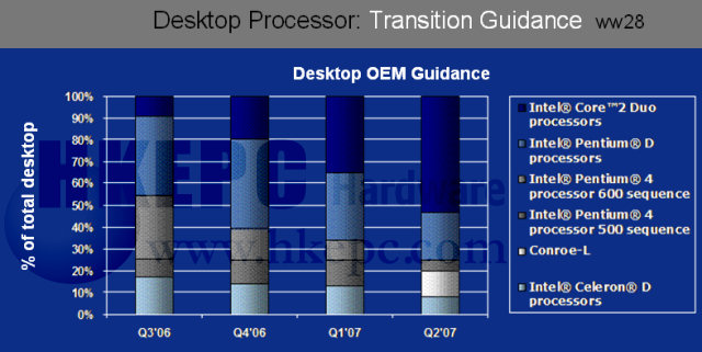 "Interessant ist ebenfalls, dass Pentium 4 600 Q2 07 vom Markt verschwindet (einschließlich des in 65 nm gefertigten Cedar Mill Modells 6x1), der eigentlich schlechte Pentium 4 500 mit Prescott (90 nm) bleibt aber im Angebot und soll den Anteil am Verkauf sogar steigern.