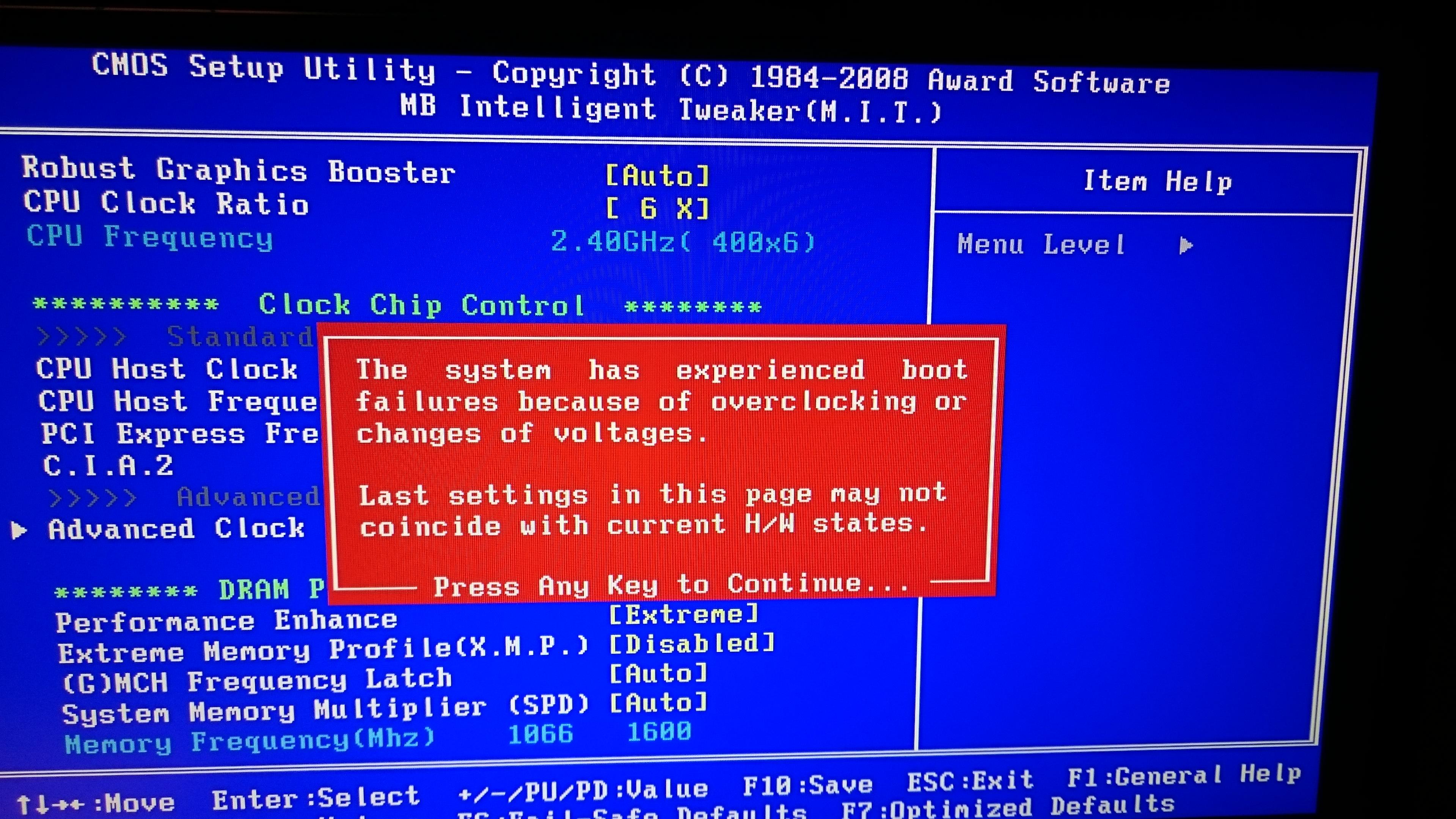 Zuerst hab ich das Problem gehabt, dass sowohl CPU-Z als auch Core Temp mir beim FSB 266 x 9 angezeigt haben. Trotz dem obwohl im BIOS eindeutig 400 x 6 eingestellt ist. Hab es auch mit 400 x 7 und auch mit 333 x 8 probiert. Doch die oben erwähnten Programme zeigten trotzdem 266 x 9 an. Nachdem ich EIST und C1 deaktivert habe wird mir nun endlich der richtige Multiplikator angezeigt (derzeit auf 6 eingestellt). Aber egal was ich für eine Frequenz angebe, es wird trotzdem nur 266 verwendet. Sowohl im CPU-Z als auch Core Temp zeigt mir dann immer 266 x 6 an.