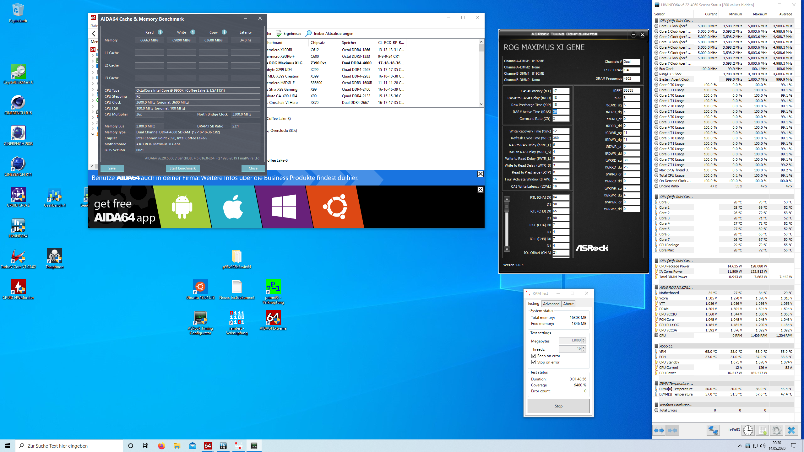 Jetzt habe ich mal die Timing von @Esenel genommen und bei mir getestet. Bessere Temperaturen und Timing muß ich noch das Maximum ausloten. RAM Spannung max. 1,465V.