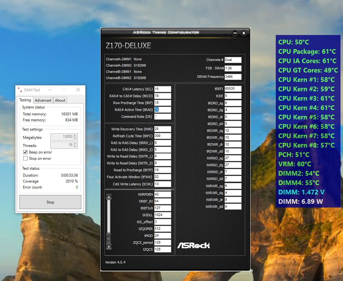 Dafür schafft er 1T, was ich auch als Ziel hatte, wenn schon nicht viel Takt geht, dann wenigestens 1T (auch wenn es nicht so viel ausmacht, ich weiß). 3600 MHz geht btw. gar nicht. Nicht mit 20-20-20-40-2T, nicht mit 1,6 Volt, nicht mit extra erhöhtem tRFC, nichtmal mit 20-24-24-40-2T...gar nicht.