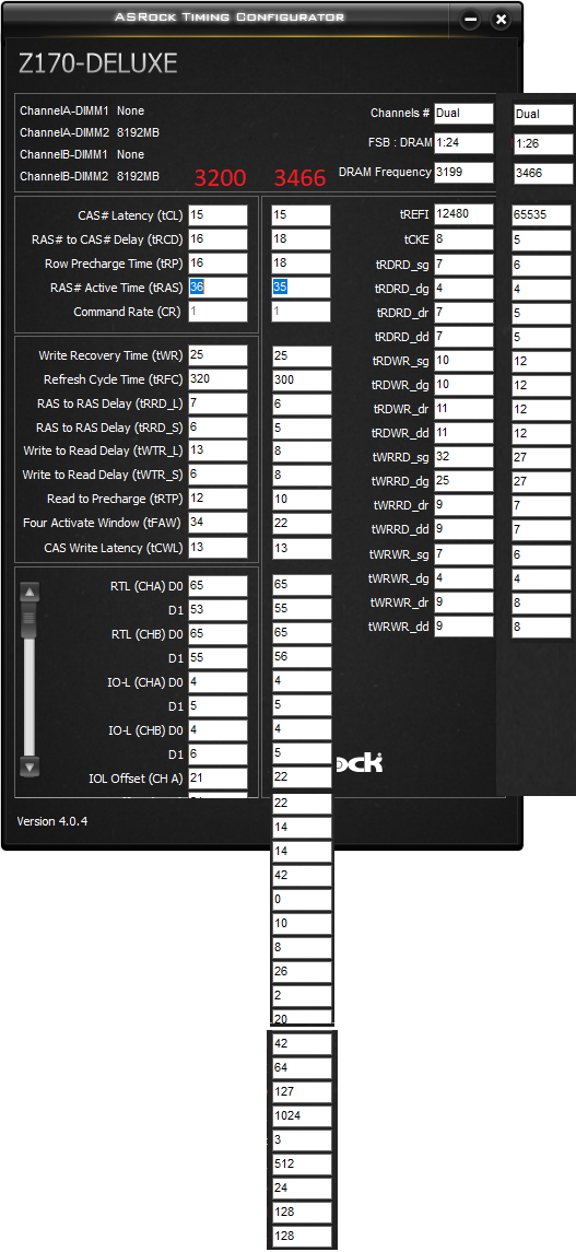 An manchen Stellt ist es erschreckend wie schlecht der D-Die im Gegensatz zum B-Die abschneidet. Bei RTL-IOL z.B. komme ich nicht weiter runter als 65. Hab Foren gefunden in denen Leute bei 3466 Mhz 48 schaffen... Auch das manulle nachjustieren durch erhöhen des "IO_Latency_offset" bringt kaum was. Dort ging nur ein Schritt von 21 auf 22. Genauso bei tWR 25. Hab Bilder von 12 gesehen...