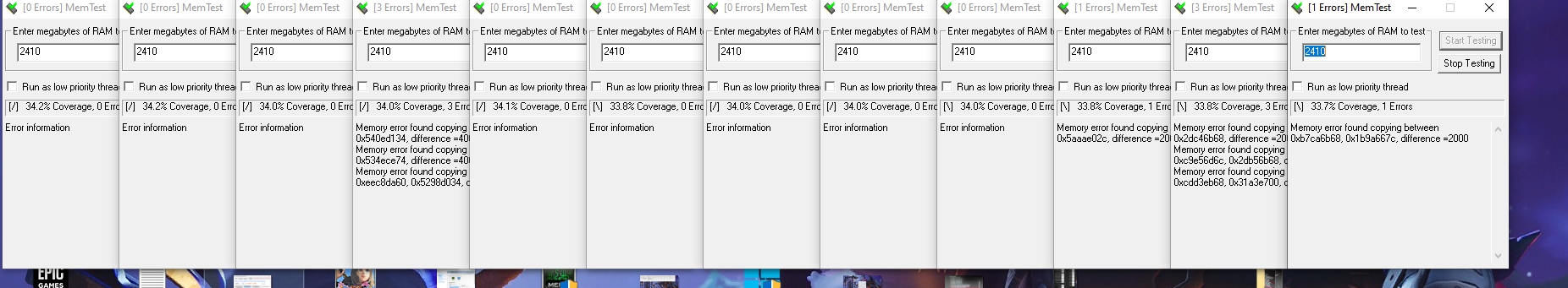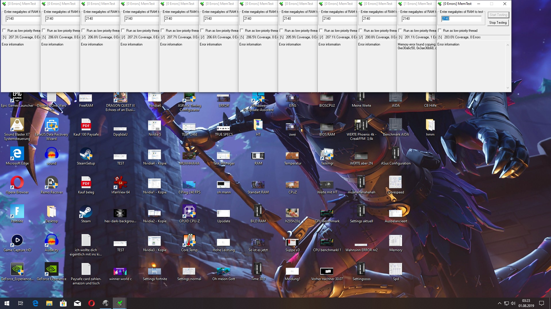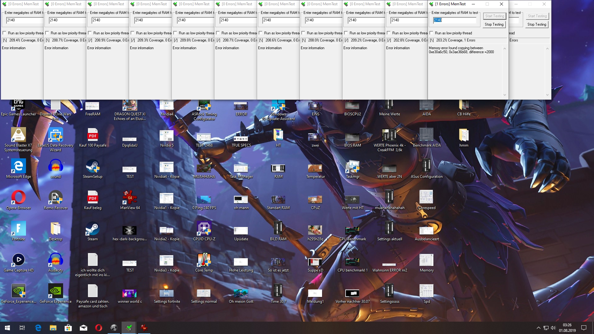 Bisher bei 28% noch kein Error. Ich gehe Mal einkaufen und lasse den diesmal länger laufen. Sind ja dann bei den Final settings. Bis hier her bedanke ich mich nochmals bei euch. Hoffe einfach diesmal kommt kein error.bin nach 22 Uhr wieder da. Dann aber wieder durchgehend. Ist schon extrem zeitaufwendig aber dafür Freut man sich dann umso mehr. Für viele andere wäre das System schon high end. Aber ich will einfach nur meine konstanten FPS in Fortnite. Dafür spring ich über meinen Schatten und Versuch es so. Mit eurer Hilfe echtm überragend. Das Spiel ist grafisch nicht der überflieger und andere haben auch 240fps durchgehend. Nach dem Fein Tuning wird es creme de la creme