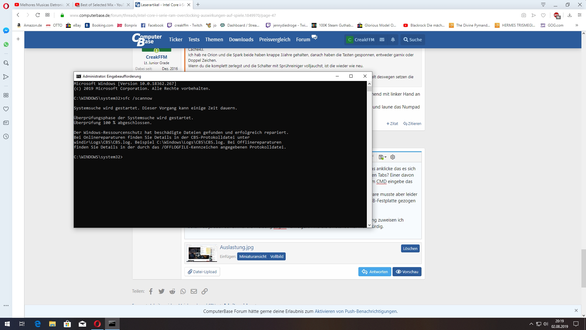 Hab nochmal ne Frage an euch. Mir kommt es so vor als wenn ich in meinem Windows etwas anklicke das es sich nicht sofort öffnet bzw reagiert. Habe Opera offen und 17 % CPU Auslastung bei zwei offenen Tabs? Einer davon ist nen laufendes Youtube Video. Find es auch komisch das wenn ich sfc/ scannow in meinem CMD eingebe das da folgendes kommt siehe Screenshot. Soll ich meinen PC Formatieren?