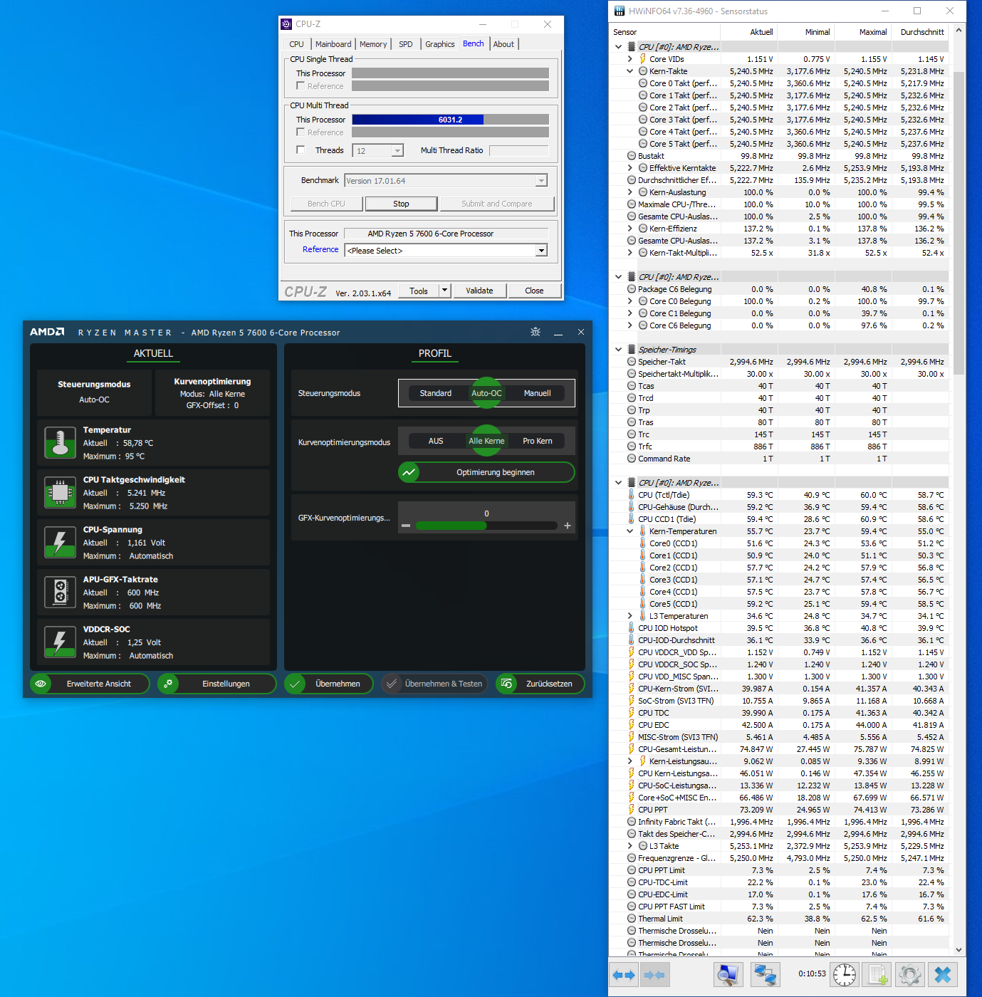 Allein mit ein-zwei Clicks und automatischer Optimierung in RyzenMaster bin ich jetzt bei 1,151volt, 5250mhz, 60 grad DIE Temparatur und bei 74 watt, nach 10min Stresstest.