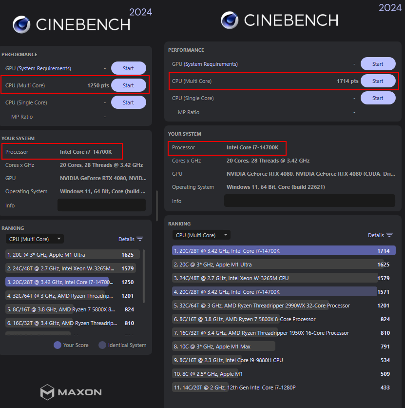 Die Mainboards ballern voll rein (300W), während Intel viel entspanntere Settings (125W) vorgibt.