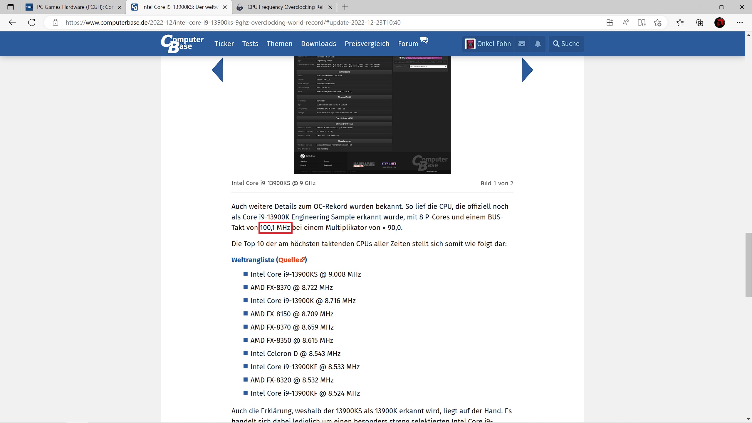 Auch weitere Details zum OC-Rekord wurden bekannt. So lief die CPU, die offiziell noch als Core i9-13900K Engineering Sample erkannt wurde, mit 8 P-Cores und einem BUS-Takt von 100,1 MHz bei einem Multiplikator von × 90,0.