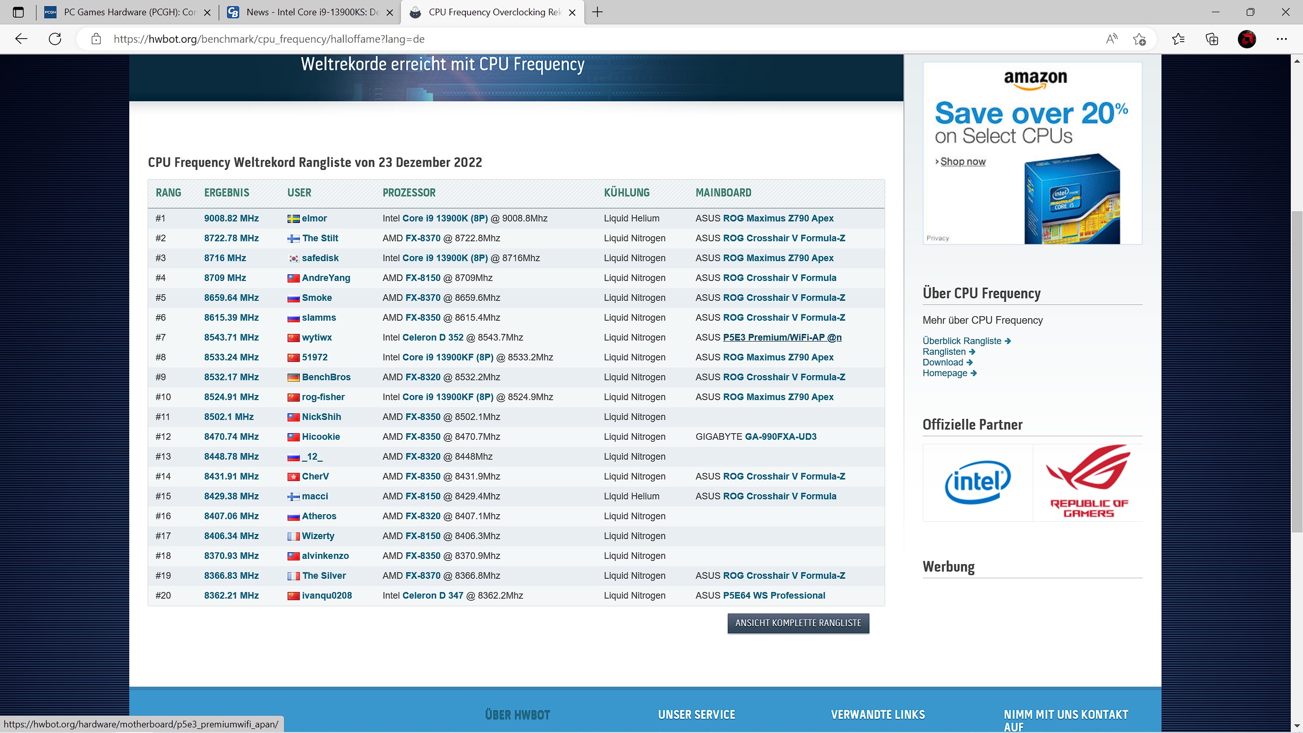 In der Zwischenzeit ist der neue Weltrekord, für den der Extrem-Overclocker „elmor“ vom Asus Overclocking-Team verantwortlich zeichnet, auch über den CPU-Z Validator entsprechend validiert und bei HWBOT eingetragen worden.
