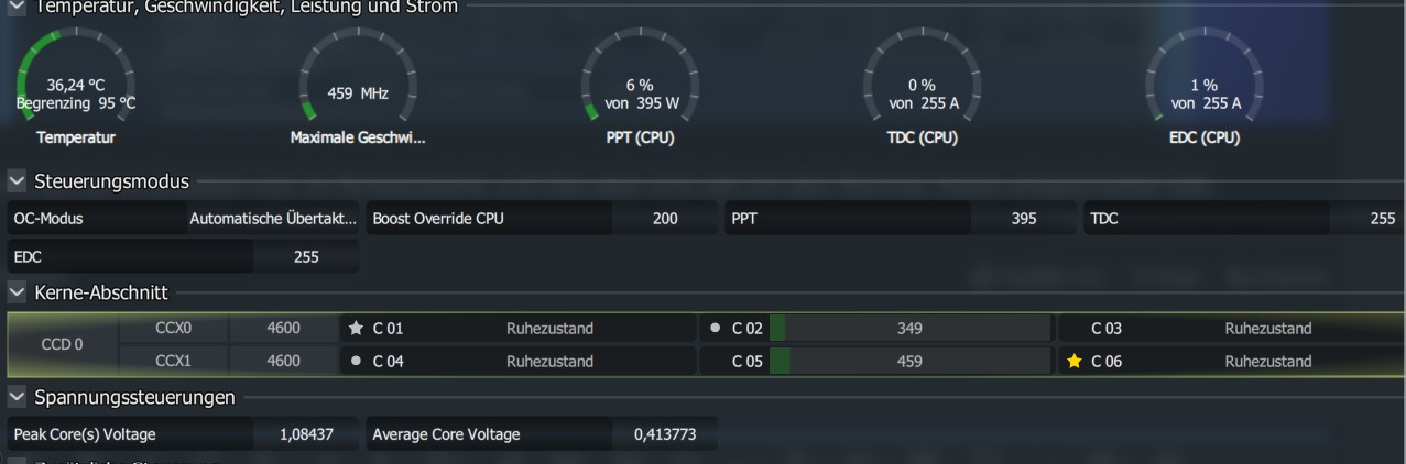 Die Peak Voltage von 1.46 sollte mit ABBA BIOS und neustem Chipsatztreiber samt Ryzen Balanced Plan aber auf dem Desktop ohne irgendwelche sonstigen Anwendungen trotzdem nicht sein.