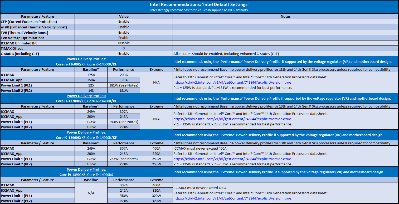 Wie zuletzt (nach dem ganzen Terz...) bei den K-CPUs so vorgesehen, ist die Intel-Empfehlung für Arrow Lake-S neben den "Intel Default Settings" das Power Delivery Profil "Performance", das erneut PL1 = PL2 setzt. Ja, Intel bedient sich hier wieder einem "Trick", denn es heißt "PL1 = 125" ist "Standard", aber "PL 1 = PL 2" empfohlen. Die Mainboards kommen inzwischen aber auch alle wieder mit Default PL 1 = PL 2 - die Empfehlung ist damit der in der Praxis gelebte Standard.Verangry schrieb:Aha, dann haben @Jan oder @Volker sicher auch ein Datenblatt dazu