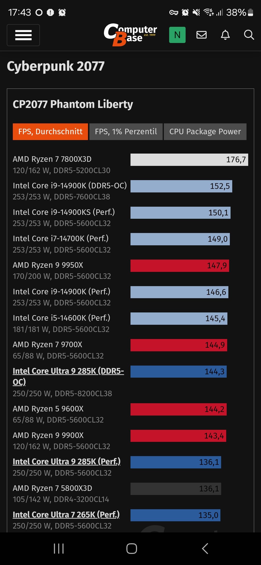 Ja es ist jetzt bekannt, Intel ist für Gamer im Moment mit den neuen CPUs nich erste Wahl. Aber immer noch besser ein paar Frames weniger und geringeren Stromverbrauch als eine 13. oder 14. Gen Intel CPU die möglicherweise eventuell beschädigt ist oder wird.