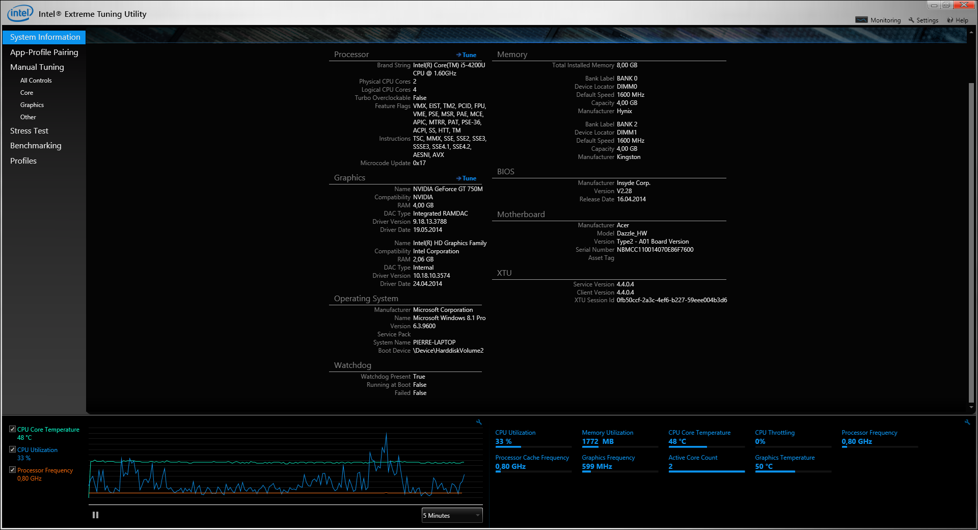 Ich habe nun das XTU von Intel Heruntergeladen, dies Bestätigt noch mal "offiziell" den Takt und die Temperatur: