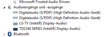 Ich hatte im Gerätemanager ein getrenntes Audioausgabedevice names "TD2340 Series + .... (Intel(R) Display Audio)", welches beim dritten Bildmodus aktiv wurde, ansonsten war entweder "TD2340 Series (Intel(R) Display Audio" oder "LG 3D TV (Intel(R) Display Audio" "angeschlossen".