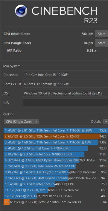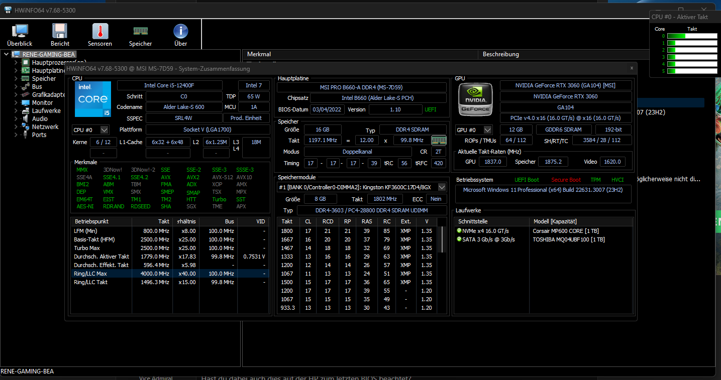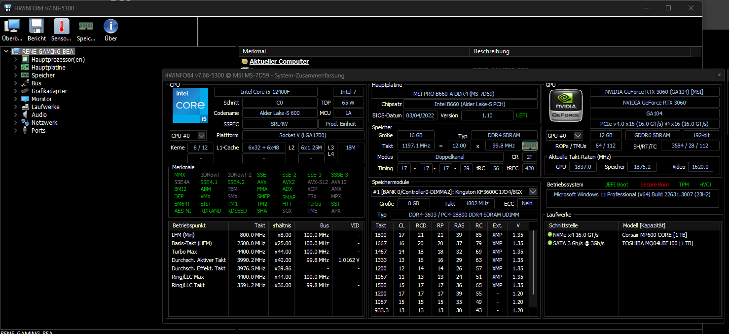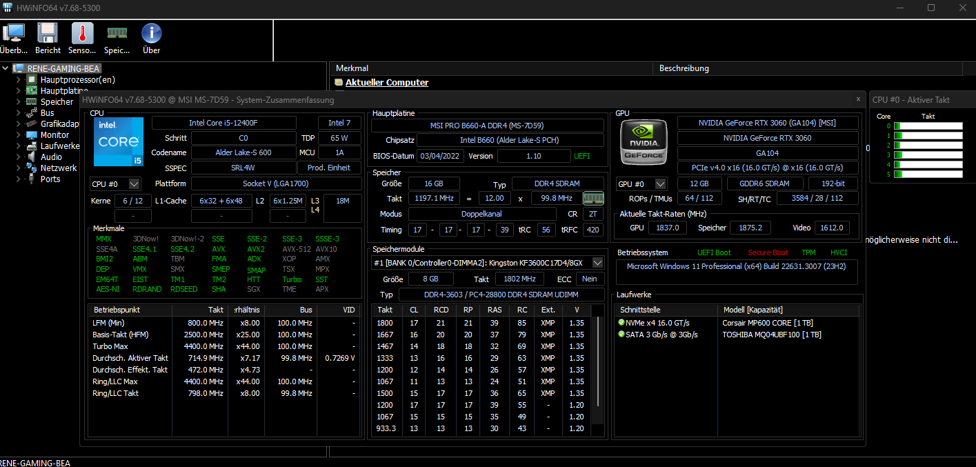 - Prozessor (CPU): Intel I5-12400F (Kühler be quiet! Pure Rock 2)