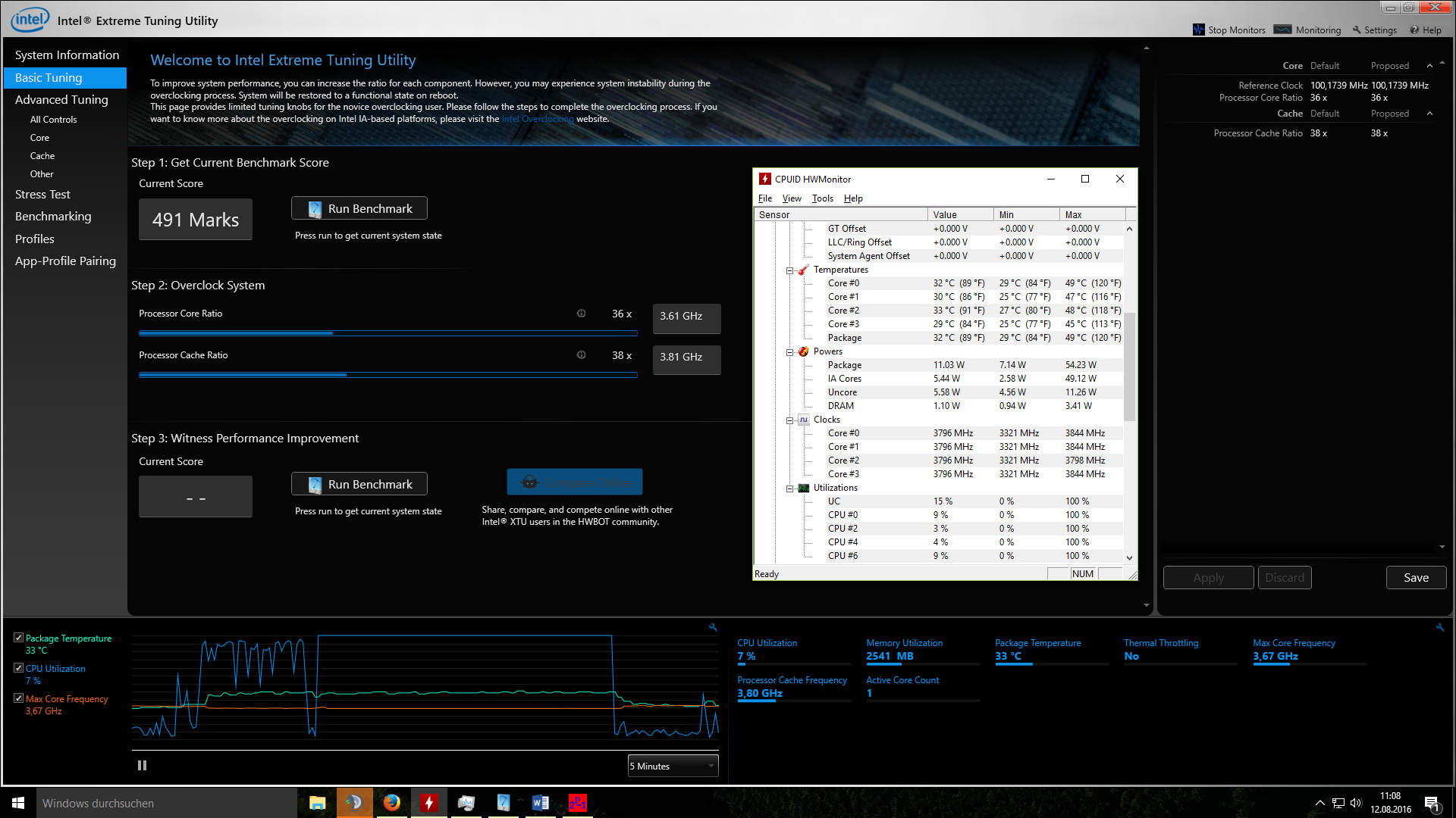 ich habe ein kleines Problem mit einer CPU, einem Intel i5 4670k. Dieser taktet unter Auslastung (Prime95) nicht auf die erwarteten 3,8 Ghz, sondern nur auf 3,4 Ghz. Im Idle (Höchstleistung als Energiemodus) hingegen läuft der Prozessor hingegen auf knapp 3,8 Ghz. Diesbezüglich habe ich zwei Screenshots als Anhang beigefügt. Zusätzlich habe ich nochmal 2 Screenshots zu den Einstellungen hochgeladen.