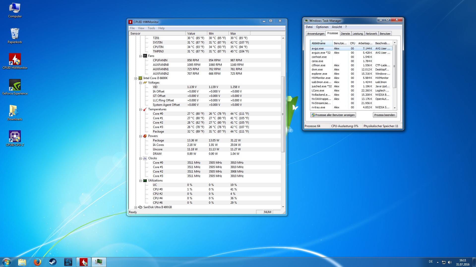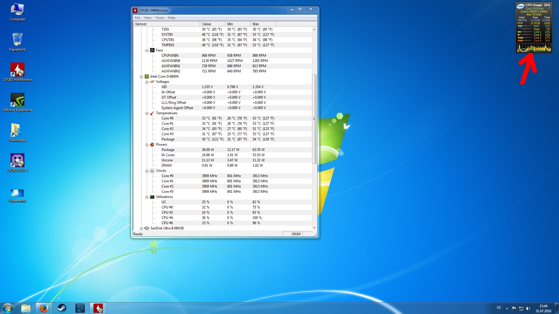 Mein verbauter i5-6600k läuft ohne Unterbrechung in seinem Boost. Direkt nach dem hochfahren schon. Unabhängig davon was ich mache. Selbst ohne laufende Programme im Desktopbetrieb (siehe Bild)