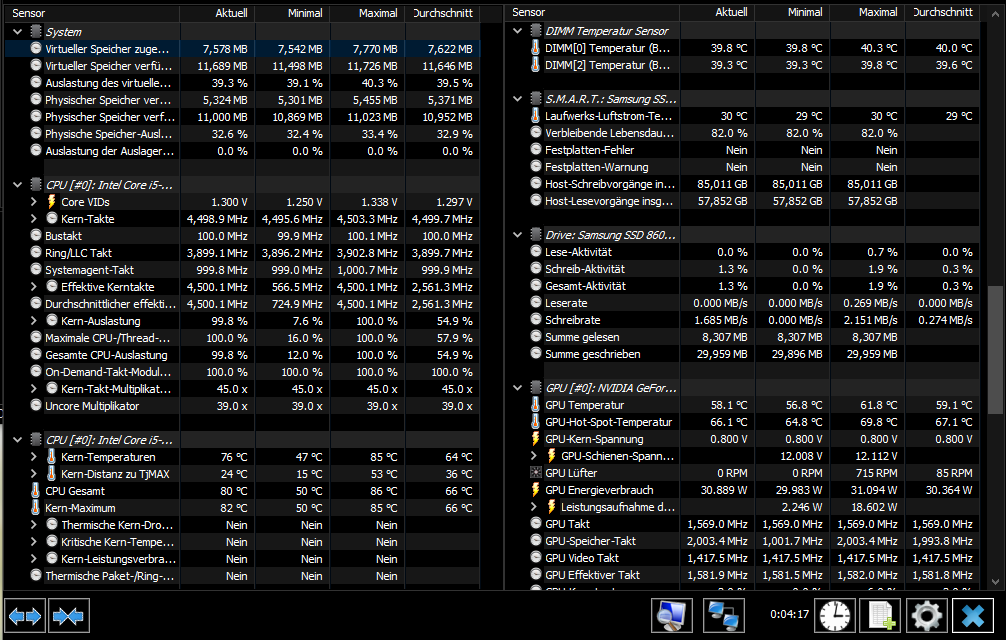 Der Rechner scheint aber 4 Minuten ständig auf 4500 zu laufen, aber die Auslastungen sind vermutlich nur 2 Minuten maximum gewesen? Weil teilweise die Auslastung im Mittel ja niedriger ist. Frage mich auch, ob er überhaupt runtertaktet im idle. Das wäre jetzt nicht zwingend nötig außer für weniger Verbrauch, aber irgendwas ist doch da etwas seltsam.