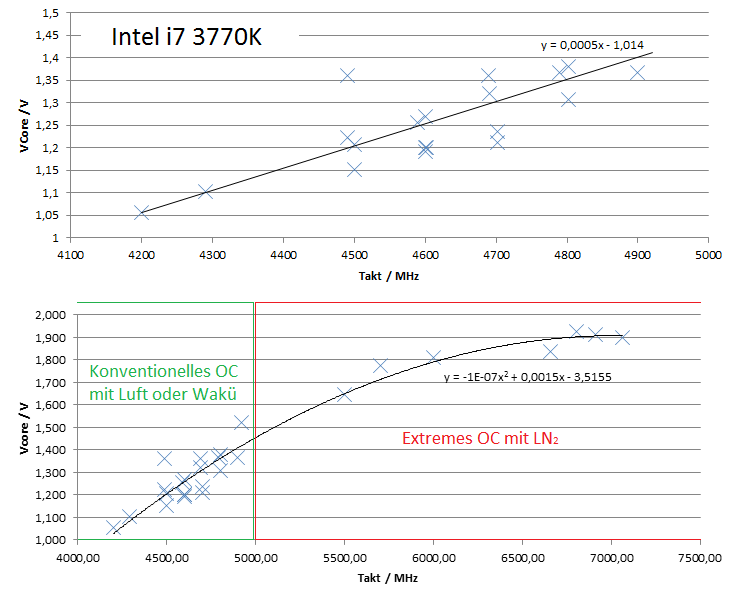 Im Bereich bis 5GHz ist die Abhängigkeit zwischen Takt und VCore linear, erst bei extremen OC ist überproportional weniger Spannung nötig um den Takt zu erhöhen.