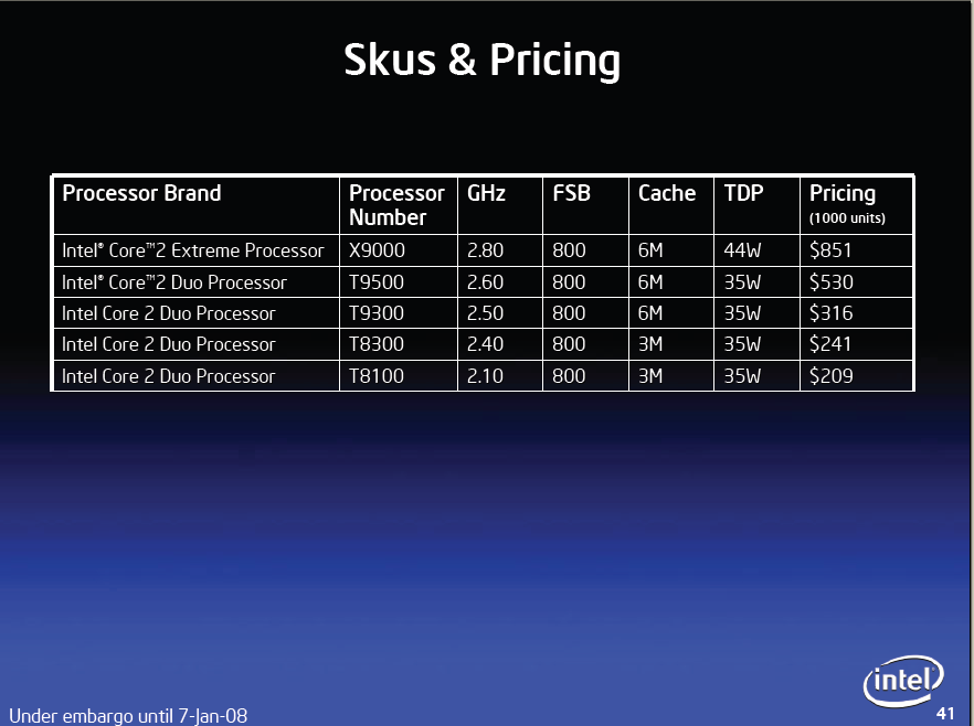 Und dein Vergleich hingt gewaltig. Core Duo hatte weder die 64bit-Fähigkeit noch hatte der einen FSB von 1066 und am allerwichtigsten war der nur 3-Fach-superskalar, während der Core 2 Duo 4-Fach-Superskalar ist.... und auch heute gibt es Low-Voltage-Core 2 Duos mit 17W TDP mit 2,13 GHz die genau so teuer sind, wie damals dein Core Duo 15W, 1,86GHz. Schau mal bei wikipedia vorbei, wenn du das noch nicht weißt....