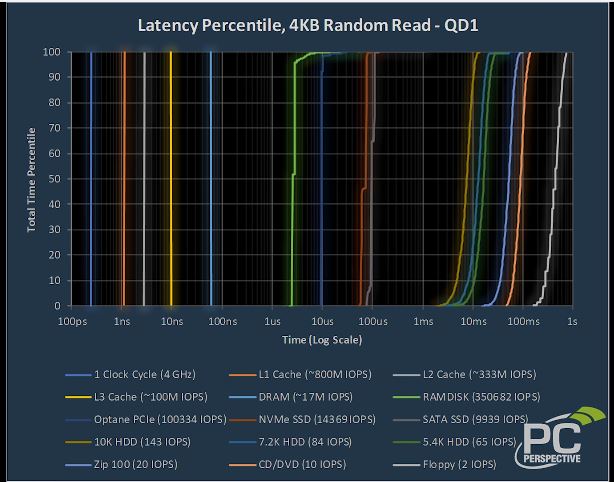 Hier nochmal eine schöne Grafik, die zeigt, dass Optane ein gutes Stück dazu beträgt, die eklatante Latenzlücke zwischen DRAM und Massenspeicher zu füllen (mit mehr Effekt als SATA zu NVME):