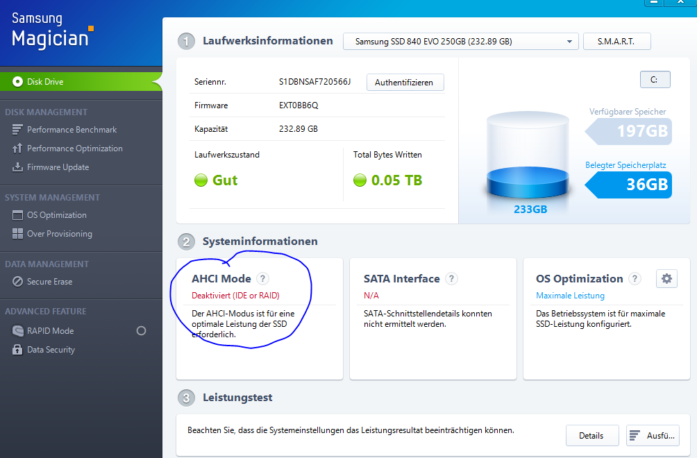 Gestern Abend habe ich mich mal daran gemacht, das gebraucht gekaufte Board samt Prozessor und der SSD zusammen zu bauen und Windows 8.1 Pro als Betriebssystem zu installieren. Im BIOS habe ich den Controller als RAID konfiguriert, damit ich als Ablage ein RAID1 aufbauen kann. Läuft auch alles wunderbar, aktuellste Software für die SSD installiert, genau so wie die aktuelle RST-Version. Nun macht mich aber der Status der Samsung Magican Software etwas stutzig: