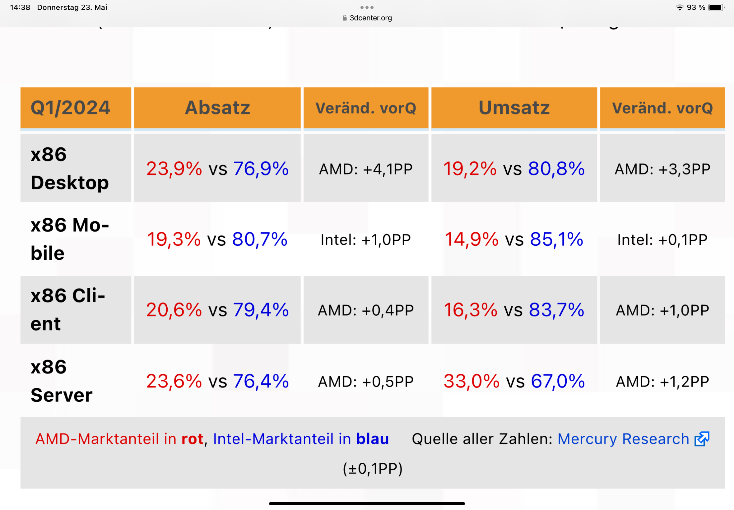Ich sehe eine AMD, die in den Marktbereichen, wo sie agiert, nach wie vor an den Anteilen knabbert und einfach nicht richtig reinzubeißen scheint (oder der Markt es nicht will). Sie sind nach 7 Jahren Zen nach wie vor nicht weiter als damals zu A64 Hochzeiten, was Anteile angeht. Und schlimmer noch. Jetzt nach dem Nachfragerückgang bzw. dem jetzt neu eingetretenen Nachfragehoch kommt Intel wieder einmal deutlich besser weg, was Anteile und Absätze angeht.