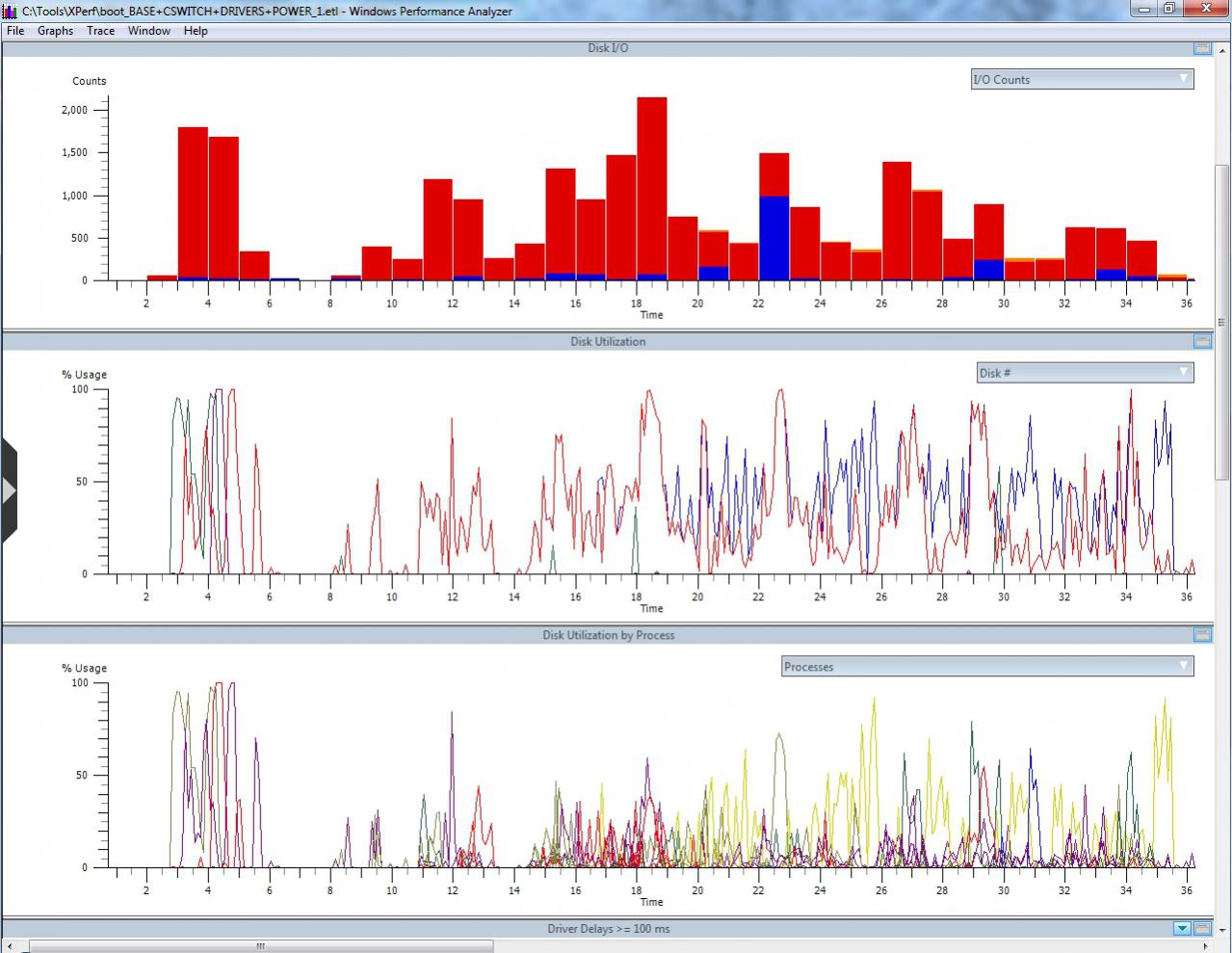 Die Disk Utilization (SSD-Last) zeigt in dieser Phase nur einen einzigen Prozess an, der überhaupt etwas lädt (lila Linie). Welcher Prozess ist das? Schau dir mal den Screen "Driver Delays" an (kann man links im Menü auswählen). Gibt's irgendeinen Treiber, der eine lange Verzögerung verursacht?