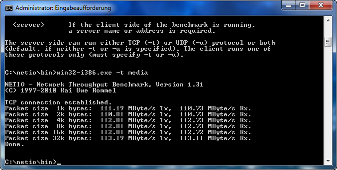 Den Screen würde ich gerne mal sehen. Das ist im GBit Netzwerk nämlich garnicht möglich. Selbst bei TCP liegt die maximale Nutzdatenrate aufgrund des Protokollaufbaus bei 96,8%. Also im unwahrscheinlichen Fall das in einem GBit Netzwerk alles absolut Fehlerfrei und unrestriktiert funktioniert sind 121MB/s drin. Und das auch nur theoretisch. Praktisch sind es 116-117MB/s auch nur mit Jumboframes und auch nur im Benchmark. Und dann läuft schon alles perfekt.Saro schrieb:P.S. Ich komme per NetIO auf 123MB/s mit der Intel NIC ohne Jumbo Frames.