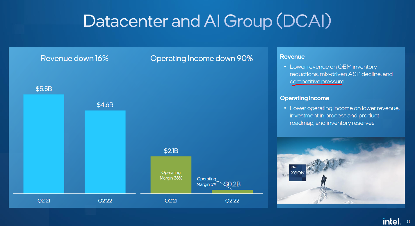 Intel gibt ja zu, dass der Konkurenzdruck das Problem im Servergeschäft ist. Die Marge haben die dort ja schon auf 5 Prozent eingestampft.