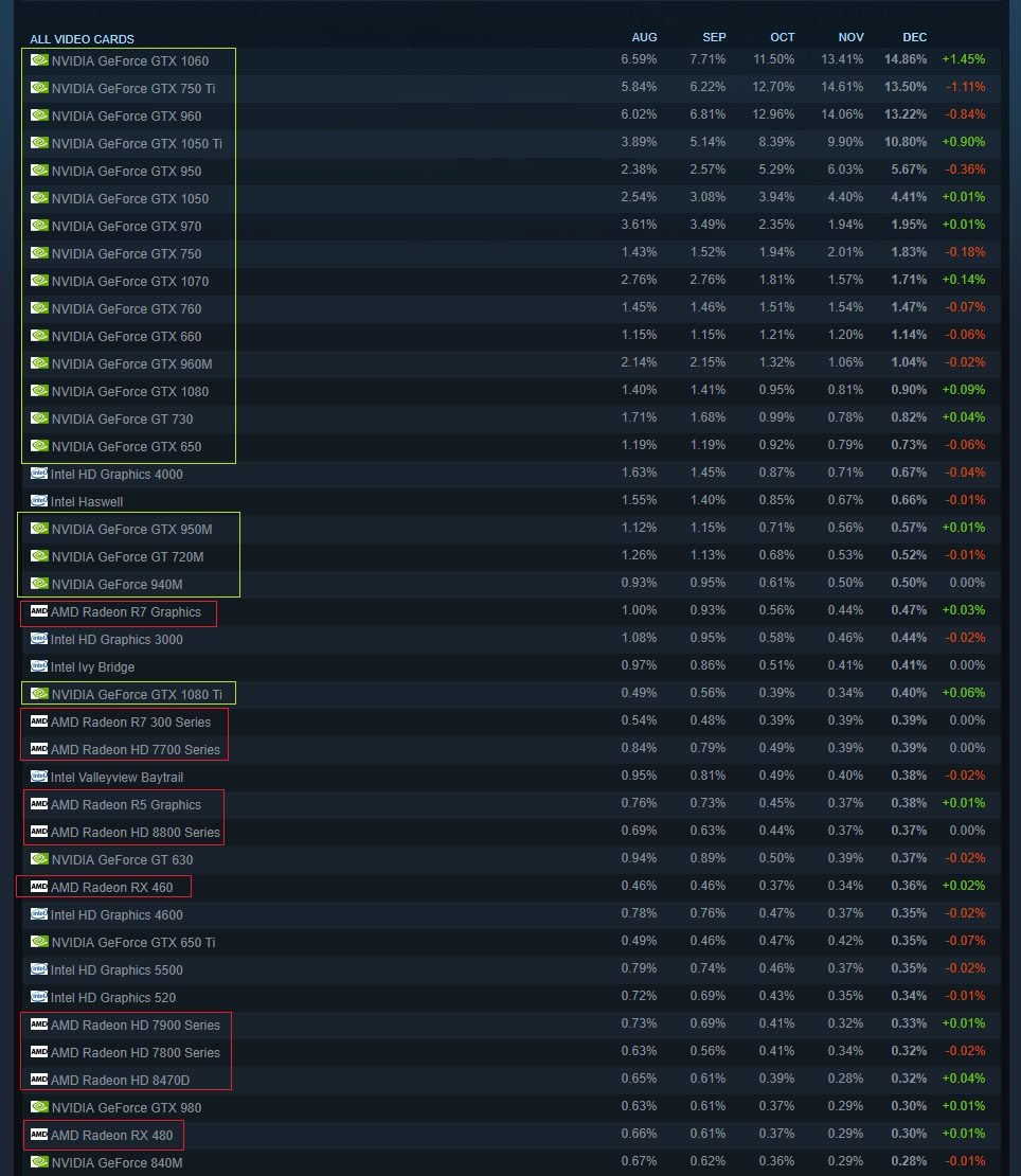 Das hat gar nix mit dem ganzen Chaos bezüglich Management Engine, oder Meltdown usw. zu tun, oder den vermurksten BIOS Updates, sondern dass ich einfach einen Blick in die Steam Statistik der genutzten Hardware geworfen habe, wo AMD insgesamt bei GPUS und CPUs nur noch eine sehr kleine Rolle spielt.