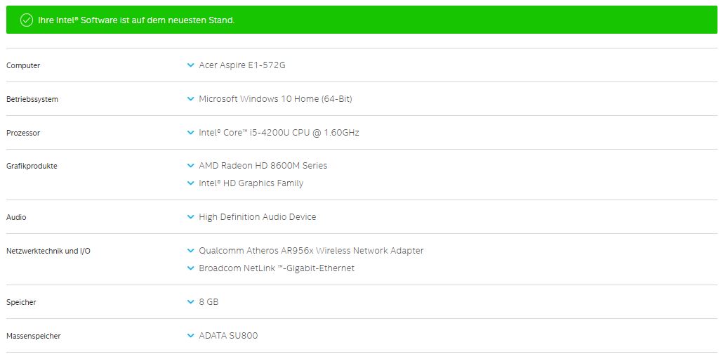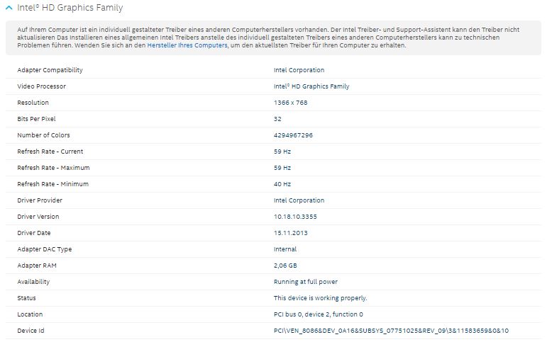 Laut 'Intel Driver Support Assistant' habe ich den richtigen Treiber installiert. Ich habe es auch schon mit dem laptopspezifischen Treiber von Acer probiert.