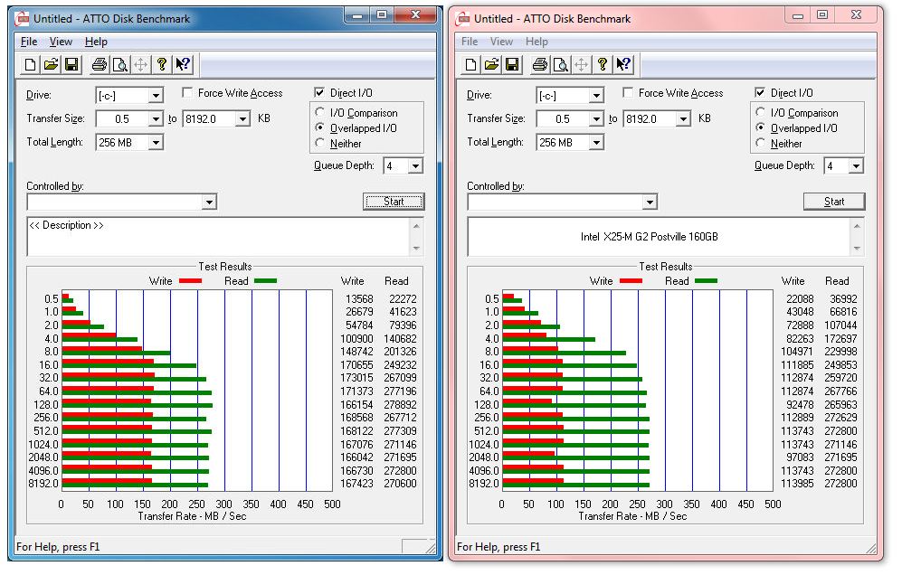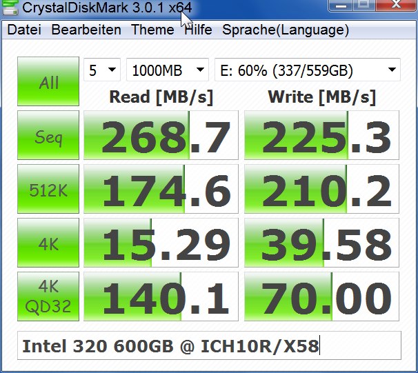 Verglichen wird die SSD mit meiner alten Intel X25-M G2 Postville 80GB sowie der neuen Intel SSD 320 Series 160GB, da für mich nur eine Intel SSD in Betracht kommt (die C300 z.B. hab ich in einem zweiten Rechner verbaut und bin, bis auf die Benchmark Ergebnisse, nicht so zufrieden damit).